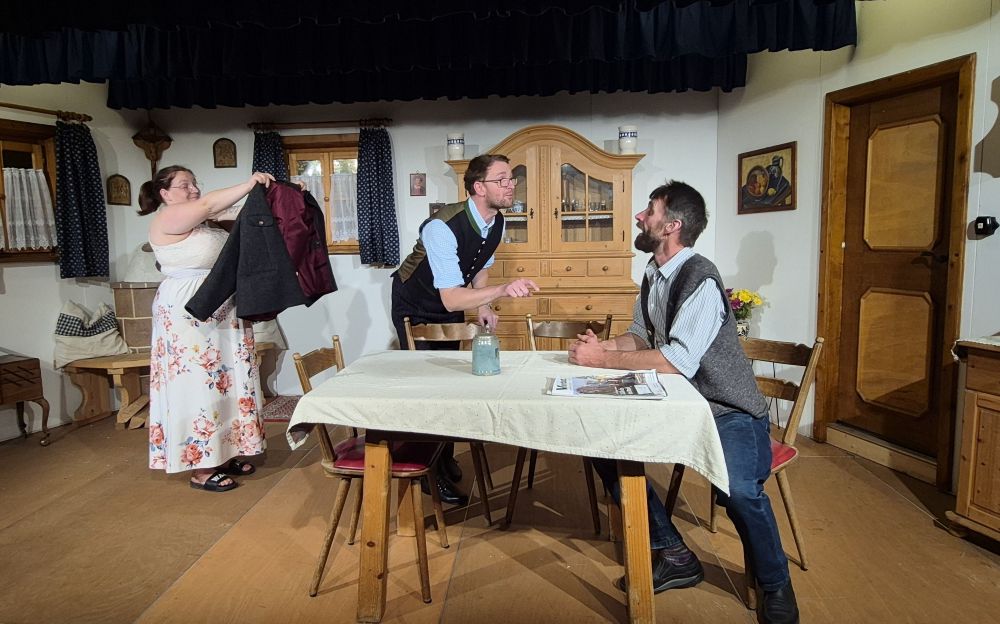 Kaspar, der Altbauer (r./ Robert Weingartner), liegt fortwährend im Clinch mit seinem Schwiegersohn "Schorsch" (m/ Franz Fischer). Hilfe von seiner Tochter "Loni" (l./ Anna Gelder) kann er dabei nicht erwarten.(Bild aus den Proben) |